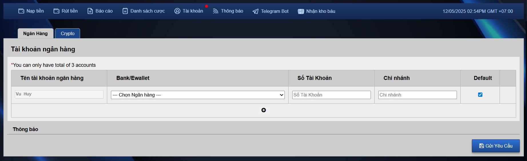 Điền thông tin tài khoản ngân hàng của bạn theo yêu cầu trong bảng, sau đó ấn "Gửi Yêu Cầu".